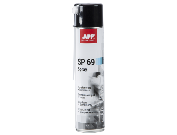 APP SP 69 Spray ist ein Druckbehälter mit Druckluft und Treibgas. APP SP 69 ist ein 2-in-1-Produkt: Es reinigt und friert ein. Der Behälter mit Düsenventil nach oben: Die Luft strömt unter großem Druck heraus und entfernt Staubablagerungen und Verschmutzungen. Mit einer zusätzlichen 15 cm langen Schlauchleitung kann die Druckluft auch an schwer zugänglichen Stellen einfacher verwendet werden. Wenn der Behälter in umgekippter Stellung (mit dem Düsenventil nach unten) gehalten wird, kann das Produkt SP 69 zum Einfrieren von Teilen vor der Montage oder Demontage sogar bis zu -69°C verwendet werden.